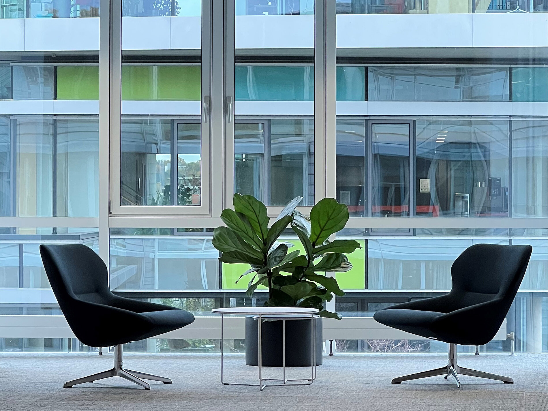 Die bestehende Achse des Kanzleigebäudes wurde über offene Galerien und eine Himmelsleiter auf den tiefer gelegenen Grundstücksteil direkt am Bahngelände geführt. So werden die beiden Gebäude zu einer gemeinsamen Einheit verbunden, die sich sehr großzügig, kommunikativ und übersichtlich darstellt. Leichtigkeit statt Gediegenheit bestimmt die Atmosphäre. Die Architektur sympobiliert damit das freundliche moderne Unternehmen. Neben Bürobrereichen wurden im Neubau ein Mitarbeiterrestaurant und ein großer Konferzenzberereich an der ehemaligen Zufahrtsstraße zum Ostbahnhof, die heute als gepflasterte Straße durchs Haus geführt wird, realisiert. Im Bestand wurden frei werdende Räume als Kinderkrippe und für weitere Besprechungsräume umgenutzt. Das Gebäude erhielt bauteilaktivierte Decken. Ein Erdkanal konditioniert die Zuluft der Quell-Lüftung der Bürobereiche vor.