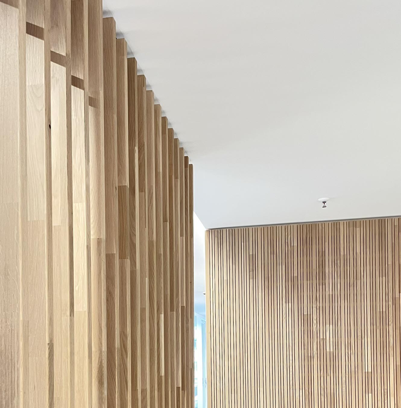 Über hölzerne Lamellenstrukturen zonieren wir die Räume, ohne kommunikative Blickbeziehungen zu verlieren.