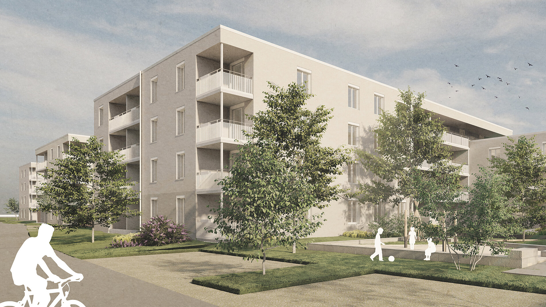 Mit einfachen, nachhaltig konstruierten Massivbauten und qualitätvoll gestalteten Außenanlagen nach dem Schwammstadtprinzip werden zeitgemäße, bezahlbare Wohnungen in einem lebenswerten, barrierefreien Wohnumfeld realisiert.
